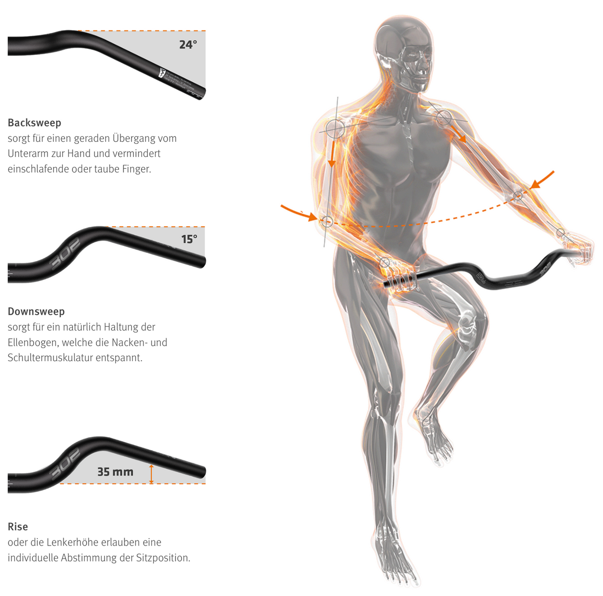 Der SQlab 302 3.0 Lenker wurde gezielt für Trekking- und Alltagsräder entwickelt und kombiniert Stabilität, Komfort und Ergonomie für eine entspannte, aufrechte Sitzposition. Der 35 mm Rise bringt den Oberkörper höher, während der ausgeprägte 24° Backsweep den Übergang vom Unterarm zur Hand begradigt. In Kombination mit 15° Downsweep ergibt sich eine körpernahe Ellenbogenposition, die Schultern „weg von den Ohren“ bringt und Nacken sowie Schultermuskulatur entlastet.