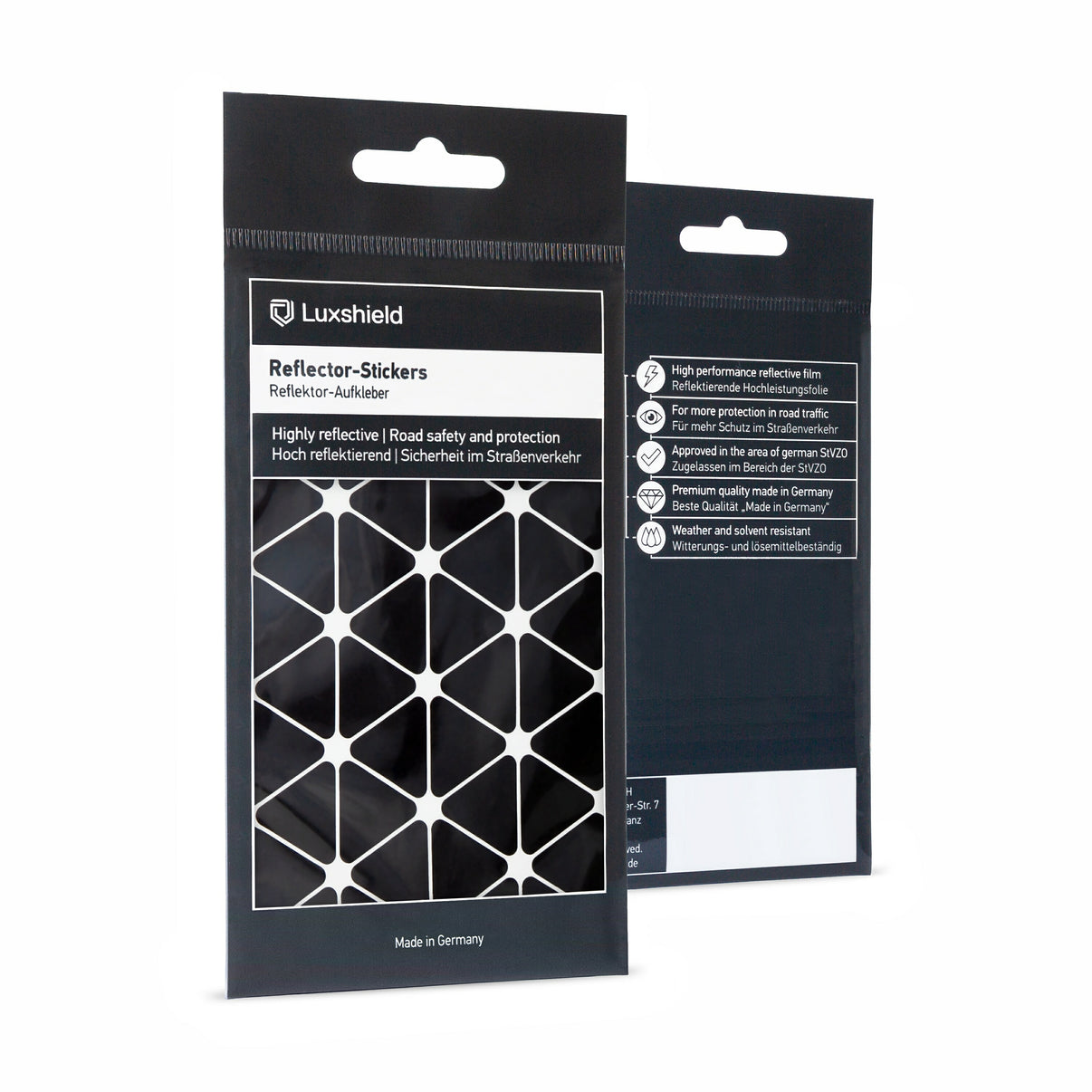 Die Luxshield® Reflektor-Sticker erhöhen die Sichtbarkeit im Straßenverkehr bei Dunkelheit und schlechter Sicht deutlich – und bleiben tagsüber unauffällig. Durch Retroreflektion wird auftreffendes Licht gezielt zur Lichtquelle zurückgeworfen; nachts erscheinen die Sticker hellweiß, bei Tag fügen sie sich dezent ins Design ein. Die Folien sind witterungsbeständig (u. a. gegen Salz, Eis, Feuchtigkeit, Hitze/Kälte und UV-Licht) und lassen sich dank Transferfolie einfach anbringen. Made in Germany steht für gleichbleibend hohe Qualität und Passform.