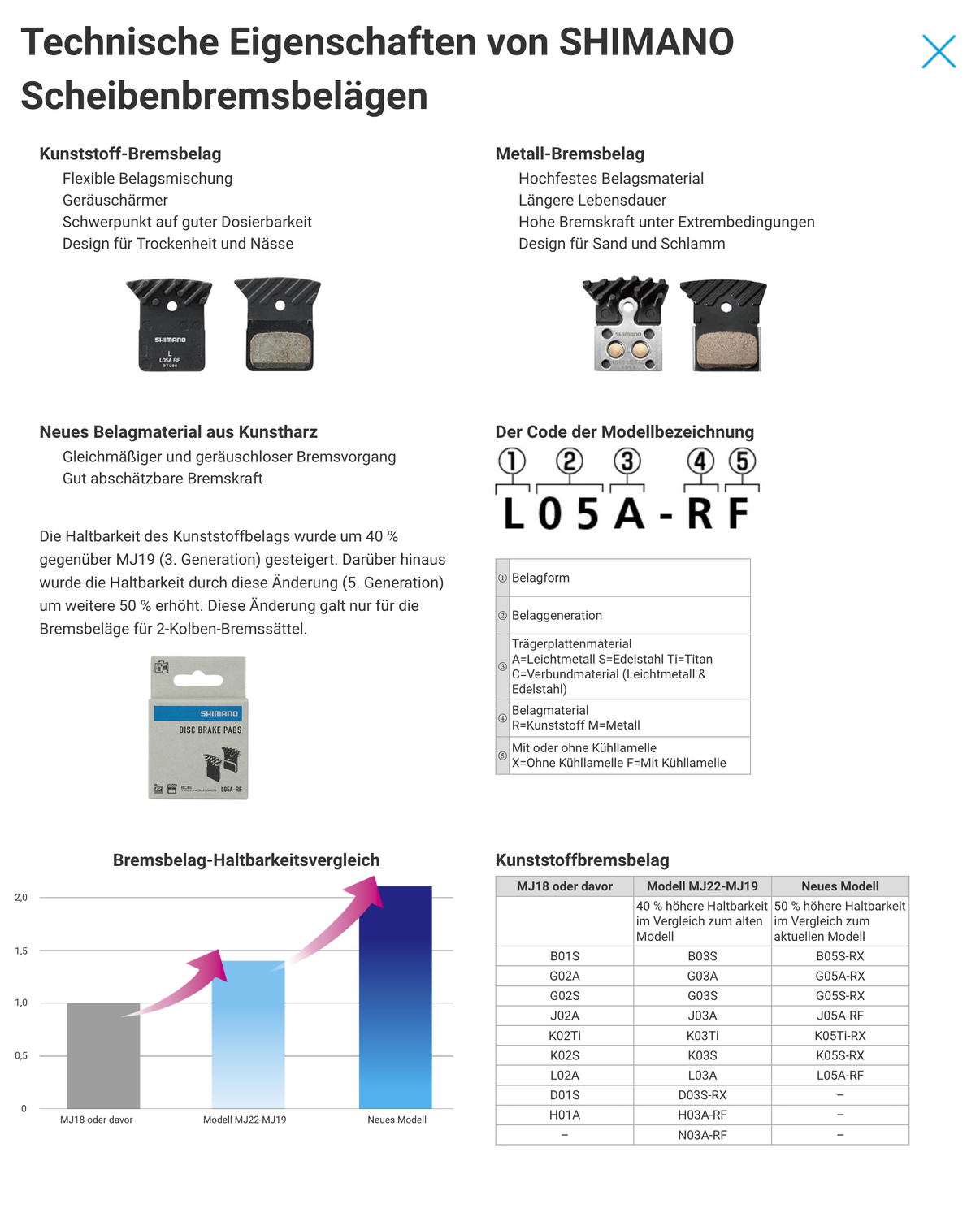 Gekühlte Shimano Resin-Bremsbeläge für konstante Bremsleistung bei Dauerlast.