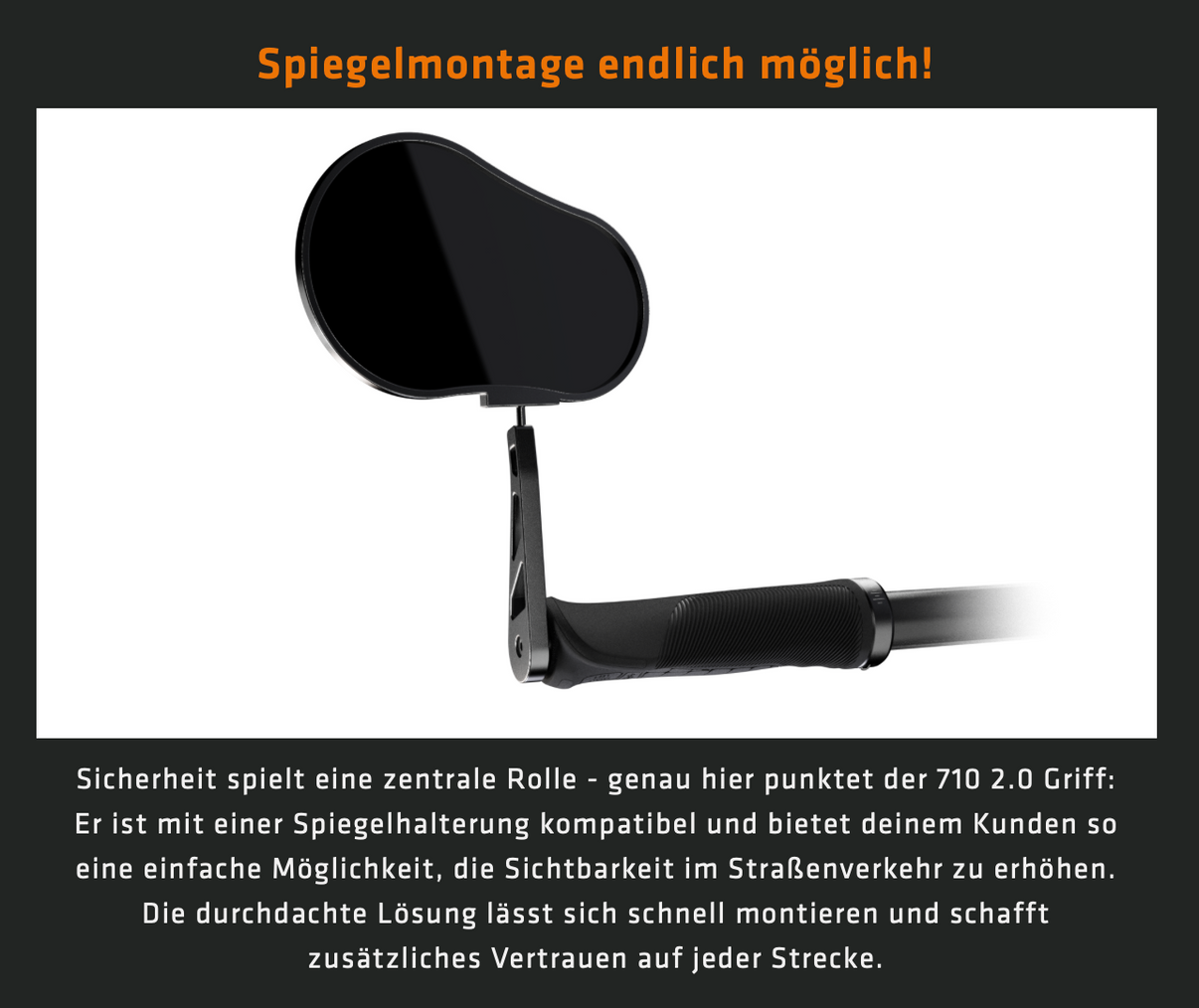 Für zusätzlichen Komfort sorgt die Lamellenstruktur im Daumenbereich, die Druckspitzen dämpft und Mikrovibrationen absorbiert. Der integrierte Ergobar (abgeflachte Griffunterseite) unterstützt eine definierte Handposition und sicheren Halt. Optional kann eine Spiegelaufnahme integriert werden – praktisch für City- und Trekking-Setups.