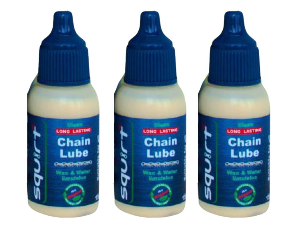 SQUIRT Lube ist ein wasserbasiertes Kettenwachs (Wachs-Wasser-Emulsion), das ohne Lösungsmittel auskommt. Nach dem Auftragen dringt die Emulsion tief in die Gelenke der Kette ein. Während das Wasser langsam verdunstet, bleibt ein trockener, schmutzabweisender Wachsschutzfilm zurück. Dadurch bleibt die Kette sauber, leise und leichtgängig – ein klarer Vorteil gegenüber klassischen Ölen, die Schmutz binden.